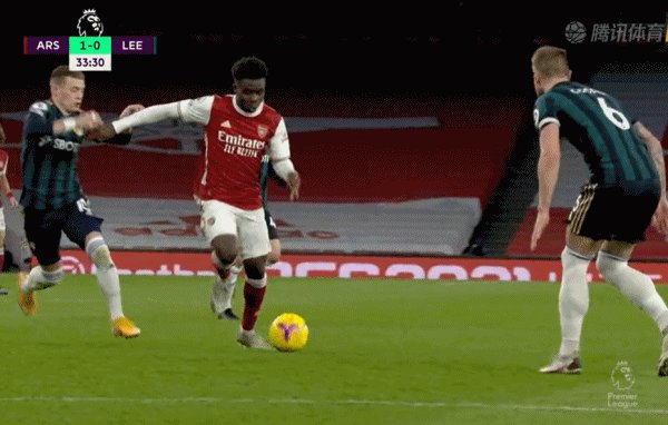 45'萨卡连续盘带制造杀机,随后阿森纳连续传递,塞瓦略斯送穿裆直塞,贝列林小角度破门得分,3比0!